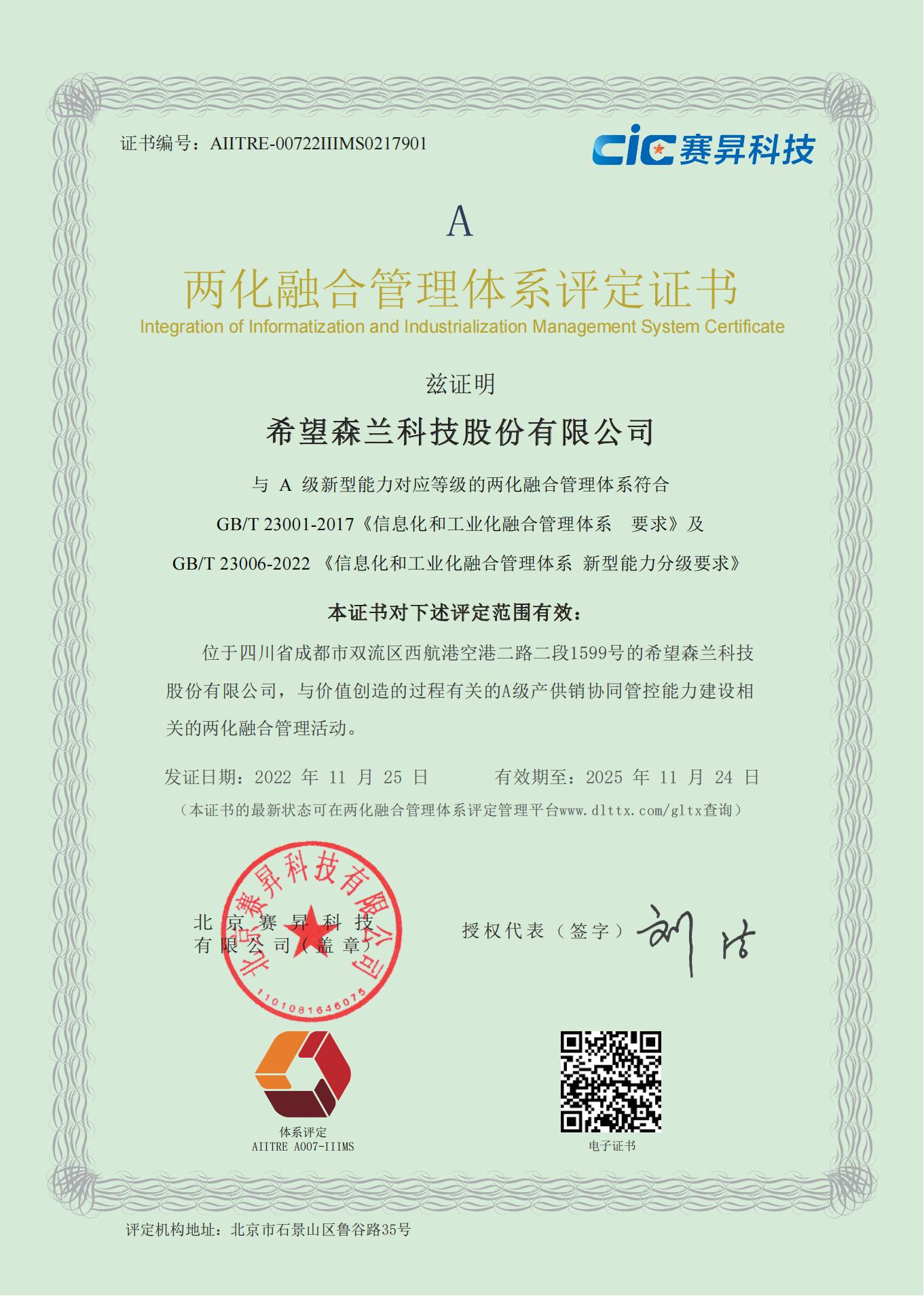 两化融合管理体系证书