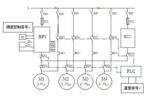 图中,BP1—太阳成集团tyc7111SB200-37T4变频器,BU—软启动器(自耦减压起动器),系统采用循环投切方式,温差信号送入PLC,经过PLC处理后,到变频器作为调速控制信号。整个系统的运行信息由PLC送到计算机上。