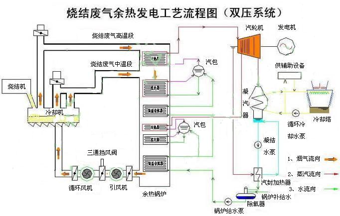 目前,国内烧结废气余热回收利用主要有三种方式:一是直接将废烟气经过净化后作为点火炉的助燃空气或用于预热混合料,以降低燃料消耗,这种方式较为简单,但余热利用量有限,一般不超过烟气量的10%;二是将废烟气通过热管装置或余热锅炉产生蒸汽,并入全厂蒸汽管网,替代部分燃煤锅炉;三是将余热锅炉产生蒸汽用于驱动汽轮机组发电。