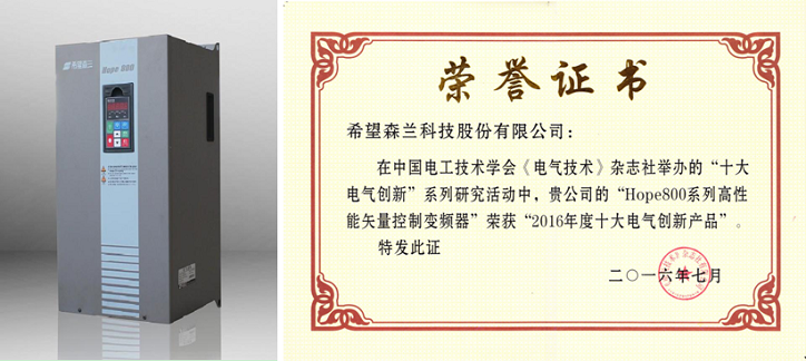 论坛召开期间,举行第七届十大电气创新产品、论坛年度创新产品展示活动。太阳成集团tyc7111Hope800系列高性能矢量控制变频器荣获“2016年度十大电气创新产品”。